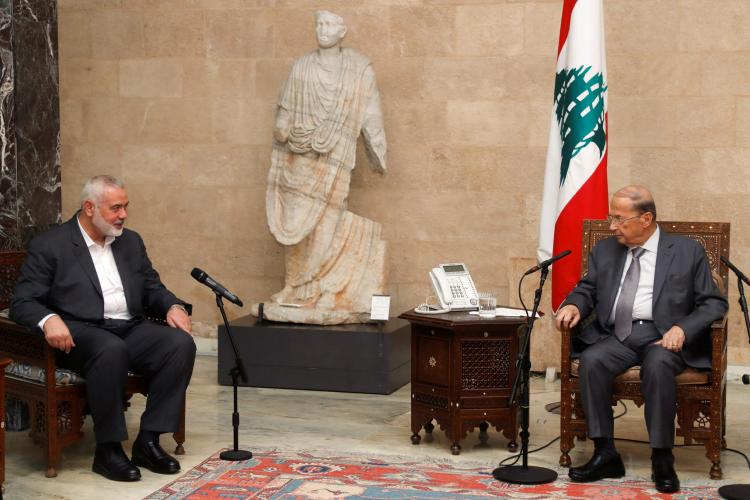 A high-level delegation from the Hamas Movement led by its political bureau chief Ismail Haneyya met on Monday with Lebanese president Michel Aoun at the presidential palace near Beirut.