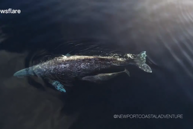 The rare footage, which was captured near Catalina Island on January 8th by the crew of Newport Coastal Adventure, even shows clouds of whale milk in the water as the calf the drinks.