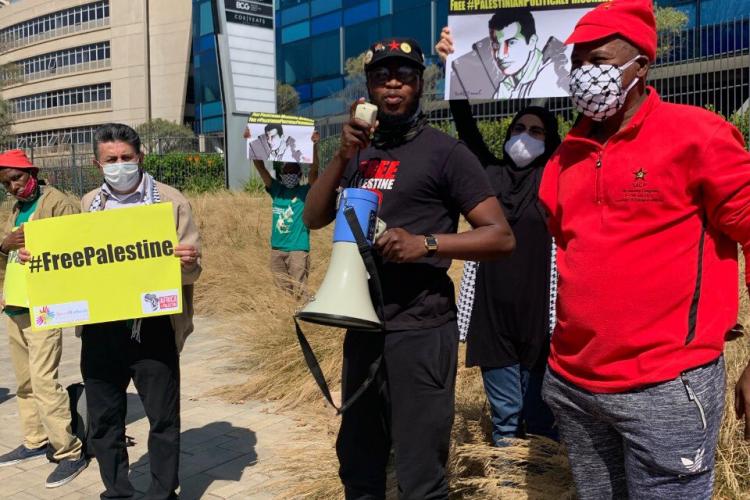 Dozens of South Africans and supporters of Palestine demonstrated outside the Israeli embassy in Johannesburg yesterday against the normalization agreement between the United Arab Emirates and Israel and demanding release from Israeli custody of Palestinian human rights defender Mahmoud Nawajaa.