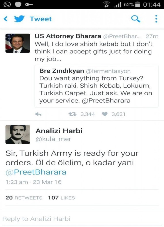 تضمنت التغريدات من هذا الحساب تغريدات من قبيل شكر المدعي العام الأميركي الذي اعتقل رضا ضراب، رجل الأعمال الذي كان في قلب تحقيقات أحداث 17 ديسمبر/كانون الأول 2013.