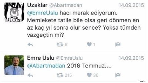 في سبتمبر 2015، كتب رداً على أحد متابعيه، الذي سأله عن موعد عودته لتركيا قائلاً "يوليو 2016 ..."