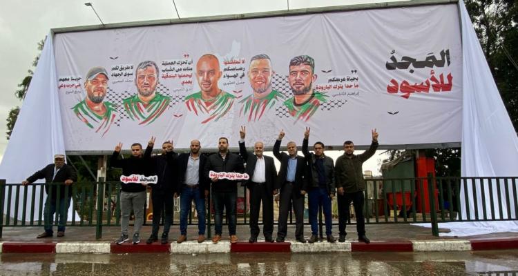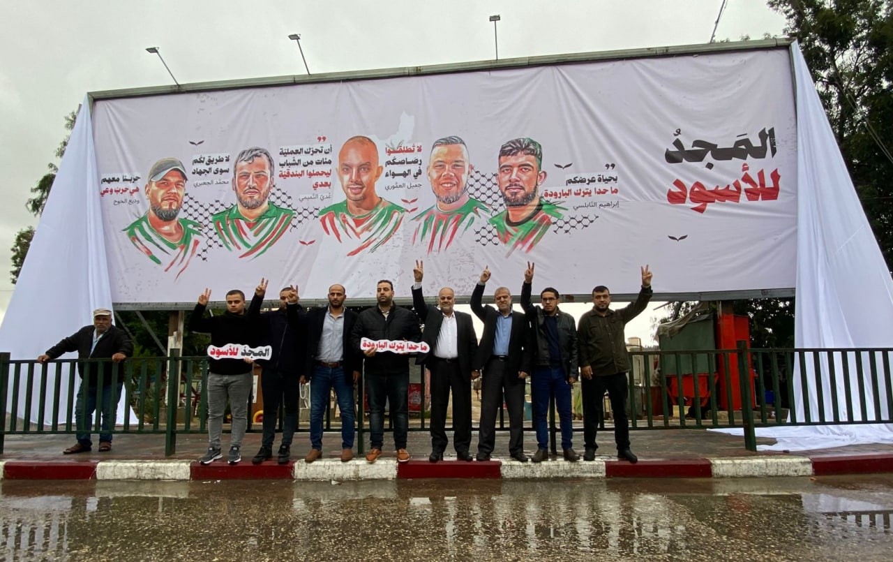 وحملت اللوحة صورًا لخمسة شهداء من الضفة الغربية، وهم إبراهيم النابلسي، وجميل العموري، وعدي التميمي، ومحمد الجعبري، ووديع الحوح.
