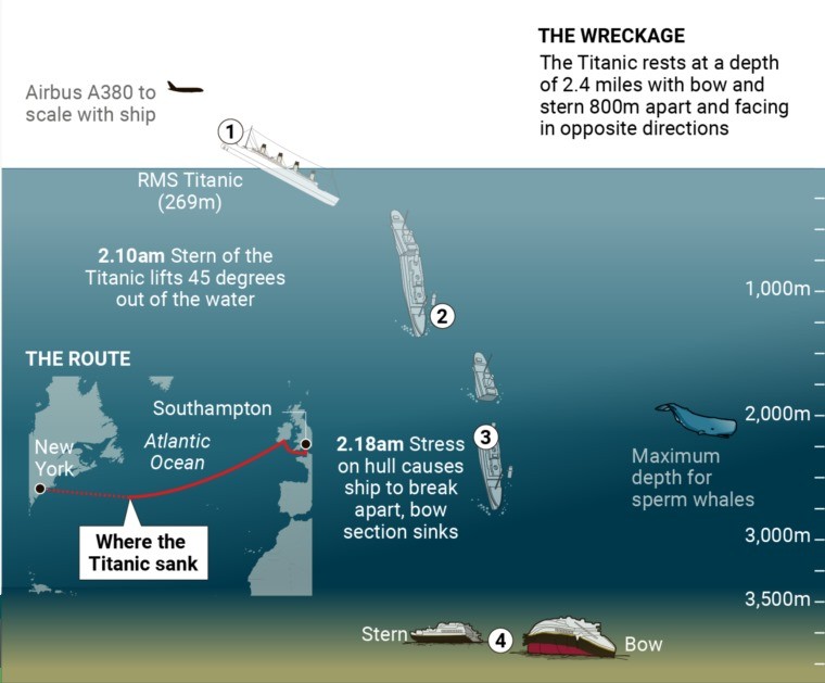 وتم اكتشاف حطام سفينة "تايتانيك"، التي كانت في ذلك الوقت أكبر سفينة في العالم، في عام 1985 على بعد 650 كيلومترًا من السواحل الكندية، على عمق 4000 متر في المياه الدولية للمحيط الأطلسي. ومنذ ذلك الحين، يزور الحطام صيادو الكنوز والسياح.