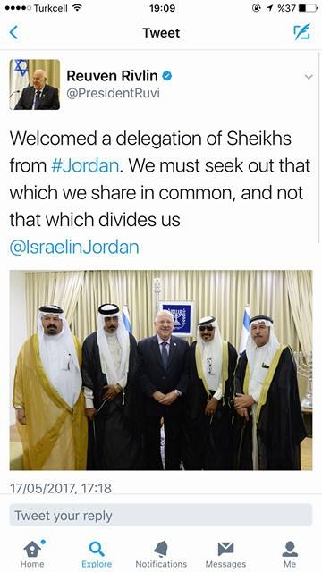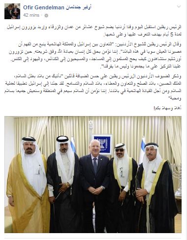 قال المتحدث باسم رئيس حكومة الاحتلال بنيامين نتنياهو أوفير جندلمان، إن رئيس الكيان الإسرائيلي ريفلين استقبل اليوم وفدا أردنيا يضم شيوخ عشائر من عمان والزرقاء وإربد يزورون "إسرائيل" لمدة 5 أيام.