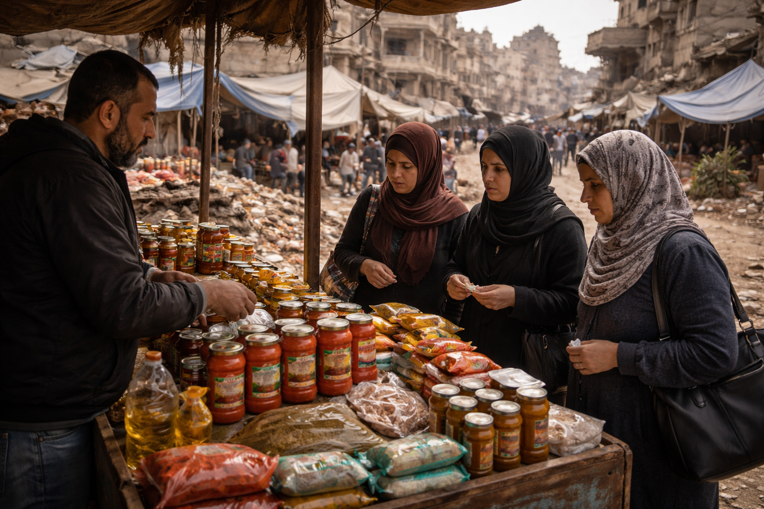 في صباح كل يوم، تبدأ أميرة بدوان "45 عامًا" مشوارها الصباحي إلى سوق البسطات المجاور لمكان نزوحها، من أجل تأمين مستلزمات وجبة اليوم لعائلتها، حيث تذهب في مشوارها اليومي منذ انتهاء الحرب دون تغير في الوقائع والأحداث.