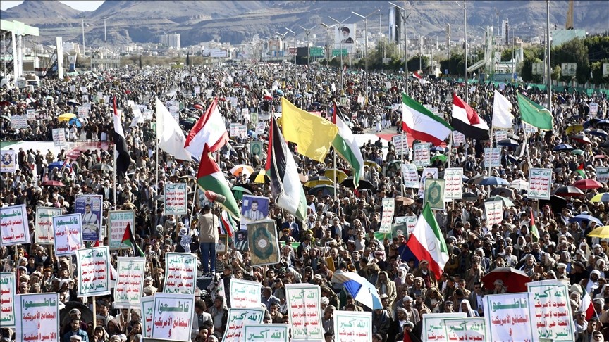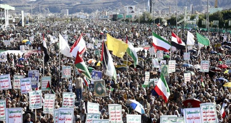 طالب عشرات آلاف المتظاهرين اليمنيين، الجمعة، جماعة "أنصار الله"، بمواصلة العمليات العسكرية ضد الكيان الإسرائيلي والولايات المتحدة.