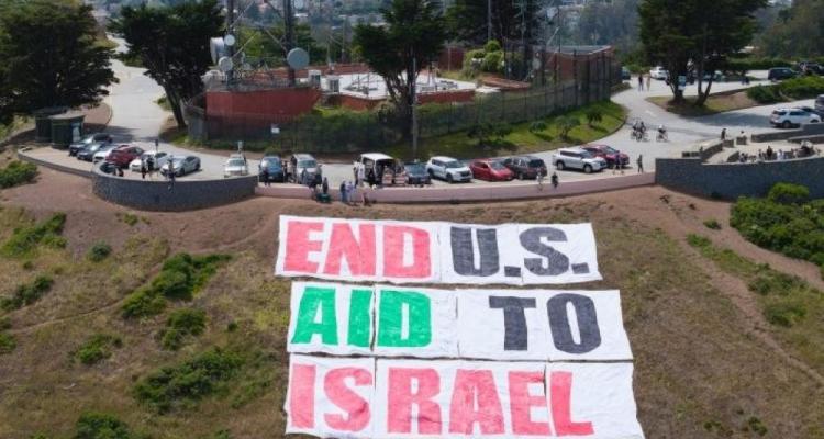 رفع نشطاء من سان فرانسيسكو لافتة طولها 120 قدمًا كُتب عليها "أوقفوا المساعدات الأمريكية لإسرائيل" على تلال توين بيكس.
