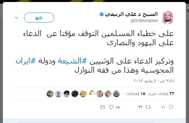 وأضاف الربيعي في تغريدة له على تويتر " على خطباء المسلمين التوقف مؤقتا عن الدعاء على اليهود والنصارى وتركيز الدعاء على الوثنيين الشيعة ودولة ايران المجوسية وهذا من فقه النوازل".