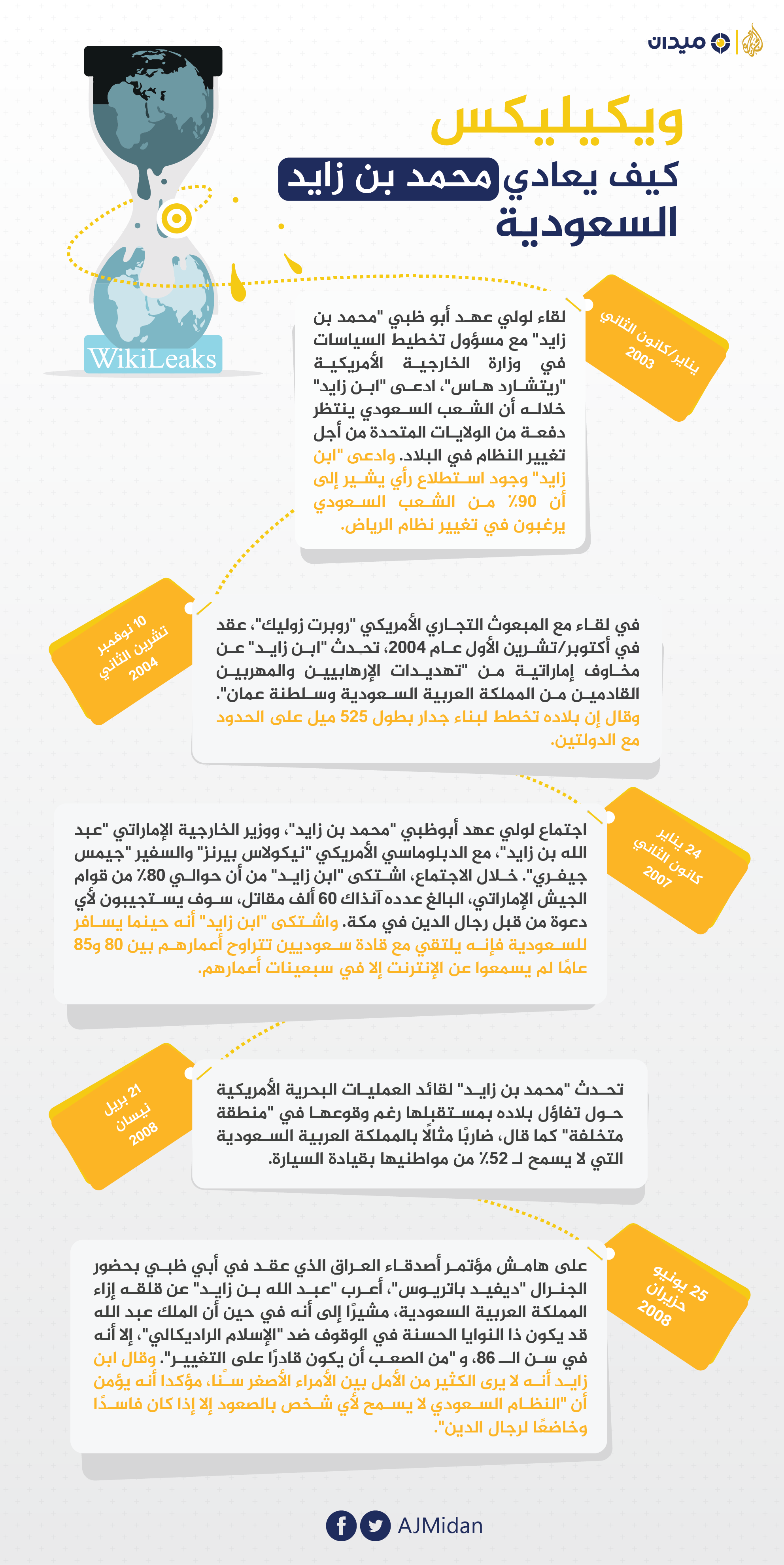 "مجموعة من الأمراء الهرمين عديمي الكفاءة القادمين من الماضي، وغير القادرين على التغيير، ونظام فاسد يتم التحكم به من قبل رجال الدين، وشعب ينتظر الولايات المتحدة لتغير له حكومته، ومنبع خصب لتصدير الإرهاب والتطرف": تلك هي صورة القيادة والشعب السعودي من وجهة نظر ولي عهد أبوظبي كما أظهرتها برقيات ويكيليكس. فضلًا عن الازدراء الشخصي الذي أظهره "محمد بن زايد" لبعض كبار الأمراء في السعودية، وعلى رأسهم ولي العهد الأسبق الأمير "نايف بن عبد العزيز"، الذي شبهه "ابن زايد" بالقرد في أحد البرقيات.