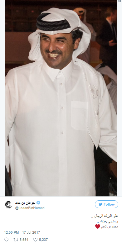 وقال جوعان بن حمد، شقيق أمير قطر، إن الأمير تميم رزق بـ"محمد"، معلقا: "على البركة الرجال.. يتربى بعزك.. محمد بن تميم".