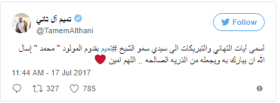 كما قال الشيخ تميم آل ثاني، نائب رئيس نادي أم صلال: "أسمى آيات التهاني والتبريكات إلى سيدي سمو الشيخ تميم بقدوم المولود (محمد)، اسأل الله أن يبارك به ويجعله من الذرية الصالحة.. اللهم آمين".