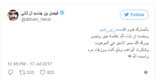 وغرد فيصل بن جاسم آل ثاني: "بالمبارك قدوم #محمد_بن_تميم، ومقدمه إن شاء الله علامة خير ونصر. بورك لك سمو الأمير في الموهوب، وشكرت الواهب، وبلغ أشده، ورزقت بره، وأسعده الله".
