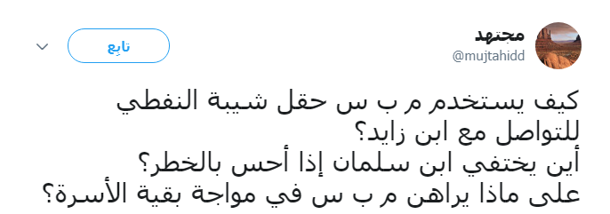 وعد المغرِّد السعودي الشهير "مجتهد"، متابعيه بالكشف عن مكان اختفاء ولي العهد السعودي محمد بن سلمان أثناء شعوره بالخطر، وكيف يستخدم ولي العهد السعودي حقل "شيبة" النفطي الحدودي بين الإمارات والسعودية للتواصل مع ولي عهد أبو ظبي محمد بن زايد، كاشفاً عن وجود رجل أعمال اشترى جميع الأمراء الذين تتابعوا على إمارة مكة.
