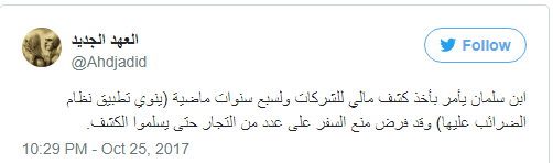 ونوّه "مجتهد" أيضاً، إلى أنَّ منع السفر سوف يطال شركات تجارية، أمر ولي العهد السعودي محمد بن سلمان بالحصول على كشف مالي منها، على مدى السنوات الـ7 الماضية، حتى إنه فرض على أصحابها منع السفر ساري المفعول، حتى يسلّموا الكشوفات، بهدف فرض ضرائب عليها.