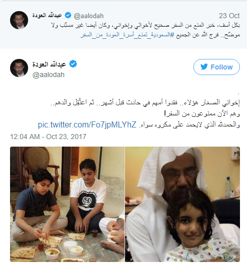 ويأتي ذلك بعد أيام من فرض منع السفر على أفراد عائلة الداعية سلمان العودة، المعتقل لدى السلطات منذ أكثر من شهر.