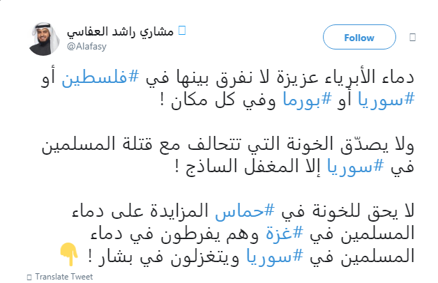 وقال العفاسي في تغريدة على حسابه، "دماء الأبرياء عزيزة لا نفرق بينها في فلسطين أو سوريا أو بورما وفي كل مكان، ولا يصدّق الخونة التي تتحالف مع قتلة المسلمين في #سوريا إلا المغفل الساذج".