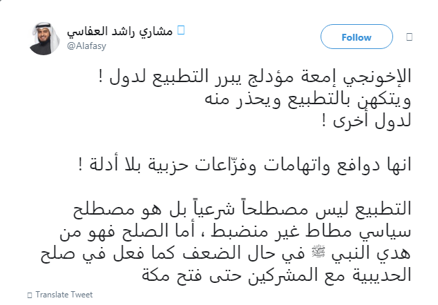 وفي تغريدة ثانية، قال: "الإخونجي إمعة مؤدلج يبرر التطبيع لدول ويتكهن بالتطبيع ويحذر منه