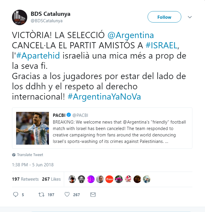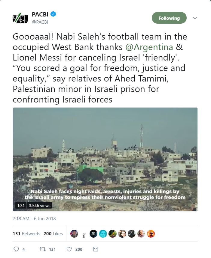 “We welcome news that Argentina’s ‘friendly’ football match with Israel has been canceled,” PACBI, the Palestinian Campaign for the Academic and Cultural Boycott of Israel, stated. “The team responded to creative campaigning from fans around the world denouncing Israel’s sportswashing of its crimes against Palestinians.”