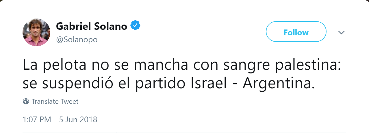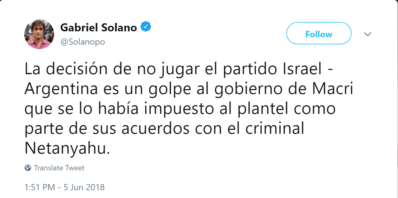 Solano added that the cancellation was a blow to the government of Argentina’s President Mauricio Macri “which had imposed [the match with Israel] on the squad as part of its agreements with the criminal Netanyahu.”