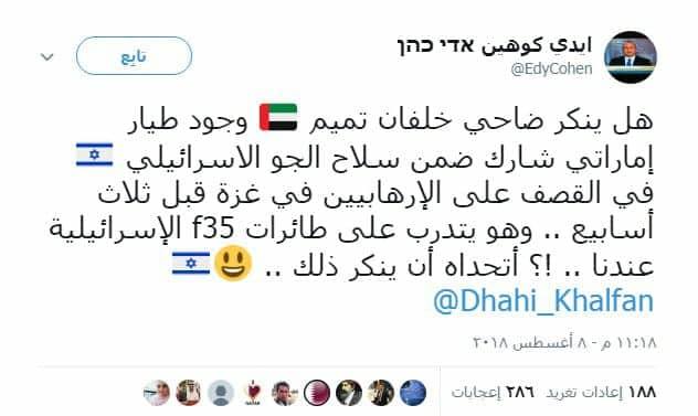 وقال كوهين في تغريدة على تويتر "هل ينكر ضاحي خلفان تميم وجود طيار إماراتي شارك ضمن سلاح الجو الاسرائيلي في القصف على غزة قبل ثلاث أسابيع .. وهو يتدرب على طائرات f35 الإسرائيلية عندنا !؟ أتحداه أن ينكر ذلك".