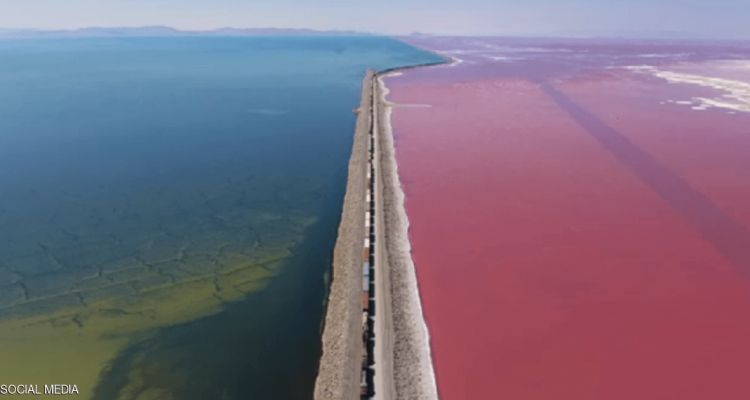 سجلت كاميرا مثبتة على طائرة دون طيار "درون" لقطات مدهشة، اكتست فيها مياه البحيرة المالحة الكبرى في ولاية يوتا الأميركية بلونين مختلفين.