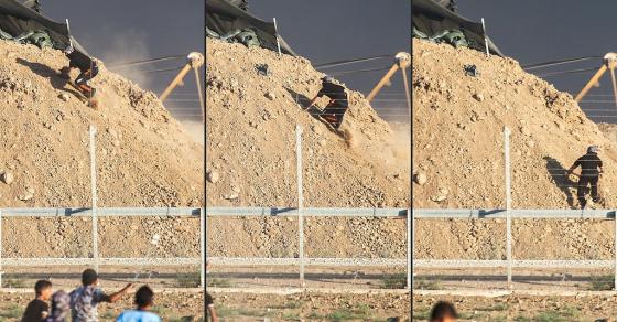 تمكّن متظاهر ضمن مسيرات العودة الكبرى على حدود غزة، من اقتحام ثكنة عسكرية تابعة لقناصة جيش الاحتلال على حدود غزة، والصعود على تلتها بالتزامن مع إطلاق النار الكثيف من جنود الاحتلال باتجاهه .