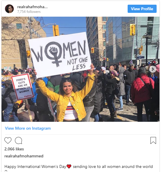 وهنأت رهف نساء العالم بعيدهن من خلال نشرها صورة لها أثناء مشاركتها في تظاهرة رافعة لافتة كتب عليها: "المرأة ليست الأقل".