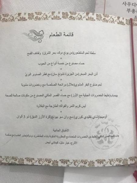 وشملت القائمة التي قدمت باللغتين العربية والكورية أمس الأربعاء الـ"بيبيمباب" (خليط خضروات جبلية) مع حساء القصر الملكي، لحم ضلوع البقر المشوي،