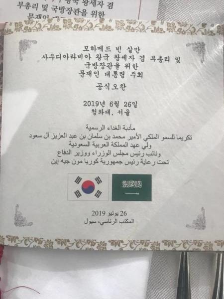 تضمنت قائمة الطعام على مأدبة الغداء الرسمية التي أقامها رئيس كوريا الجنوبية مون جيه إن، لمحمد بن سلمان في القصر الأزرق الرئاسي في سيئول العديد من الأطباق الكورية الشعبية.