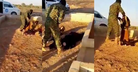 وأظهر المقطع سحب العنصر للشابين والمرأة وهم مكبلو الأيدي، من سيارة تابعة للمليشيا إلى ساحة ترابية تابعة لأحد المنازل، وبدأ عنصر الوحدات الذي يرتدي قناعا بخلع حجاب المرأة والاعتداء عليها بالضرب وعلى الشابين اللذين معها، ليقوم في نهاية المقطع بالتبول عليهم.