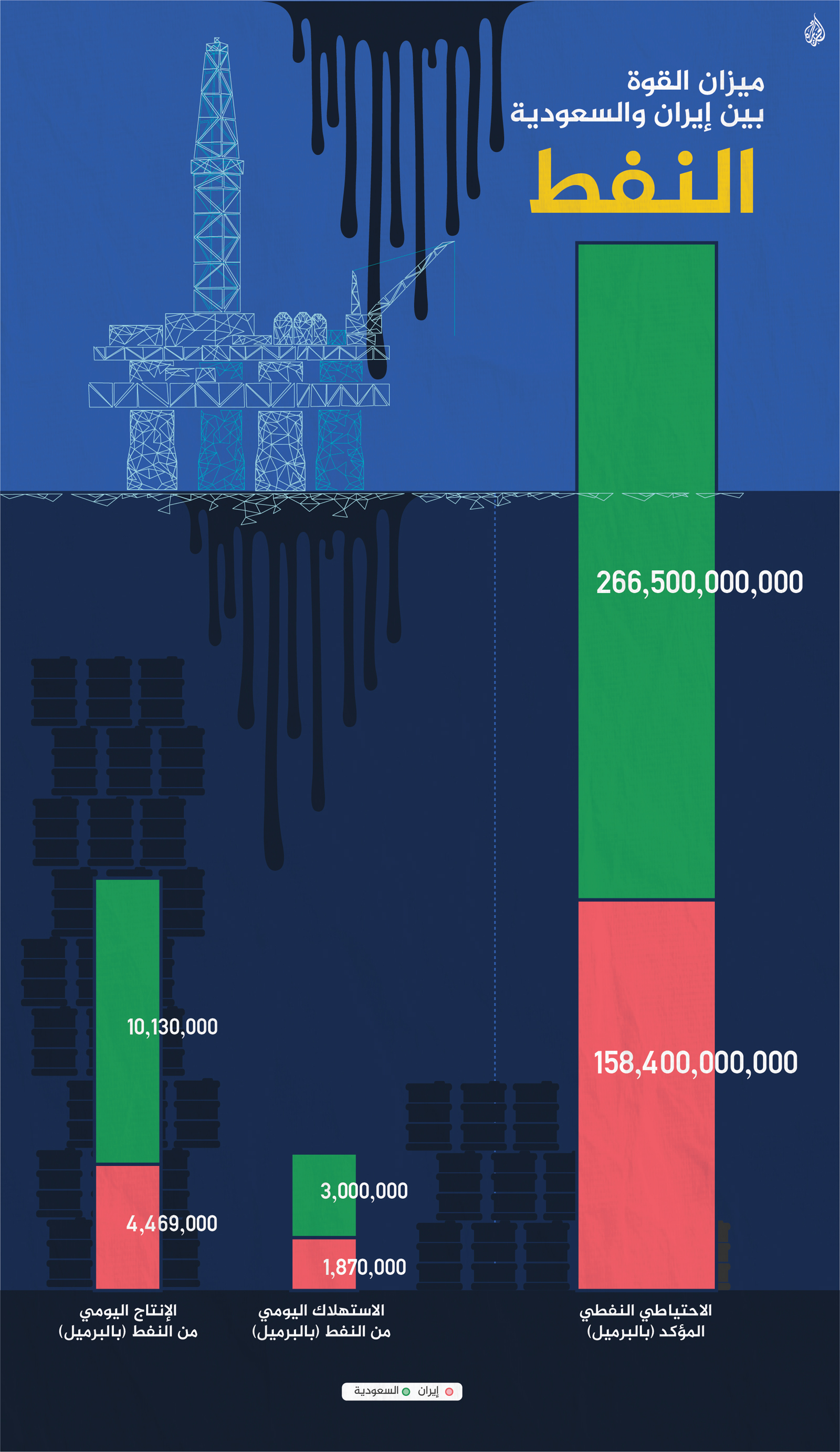وفي مجال النفط وهو أهم مصدر للمال في الدولتين، تبدو الكفة راجحة بشكل كبير لصالح السعودية إنتاجا وتصديرا واحتياطيات، حيث تنتج السعودية أكثر من 10 ملايين برميل يوميا، بينما لا يعرف على وجه التحديد حجم الإنتاج الإيراني في الوقت الحالي.