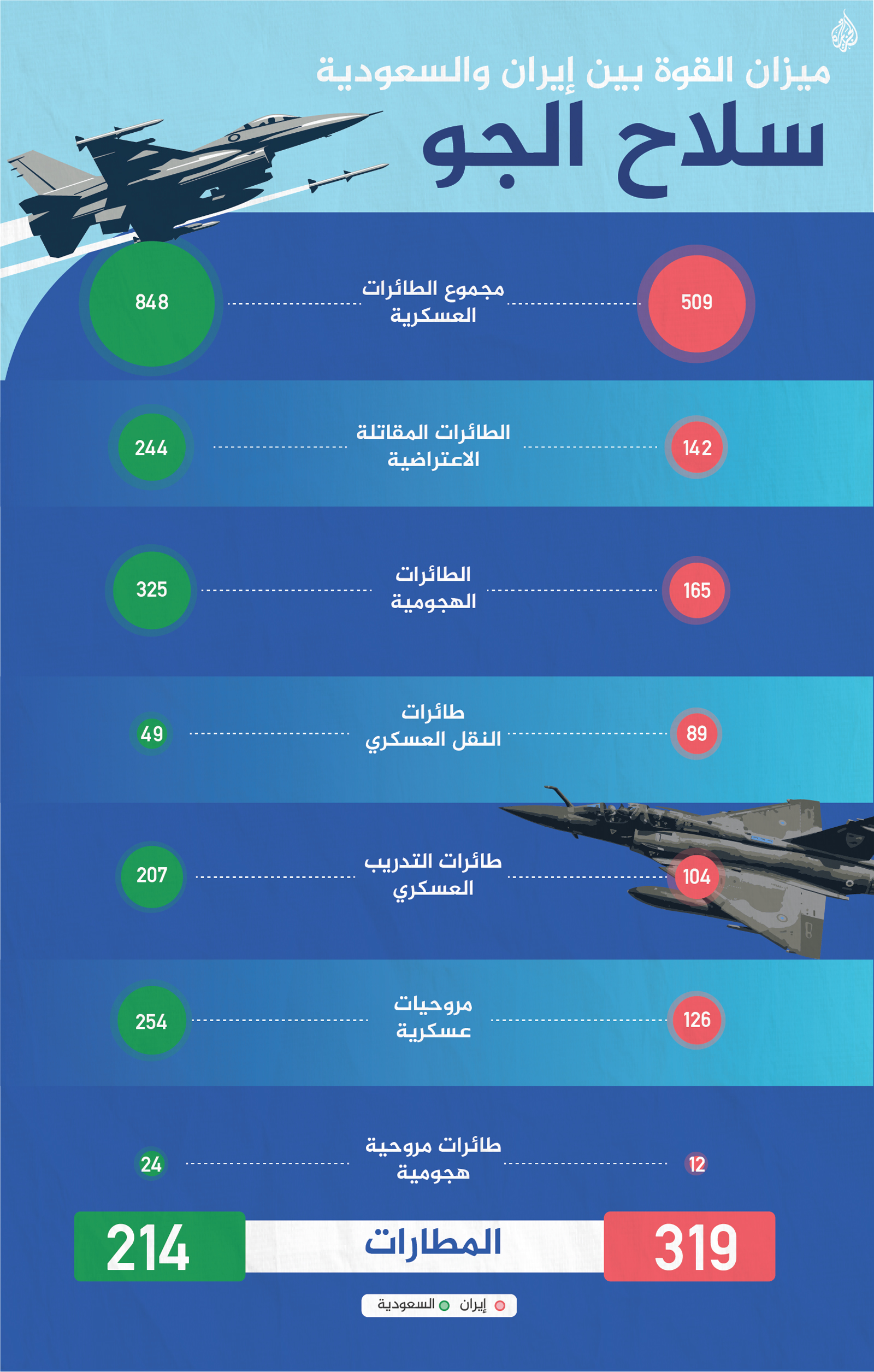 تتفوق السعودية على إيران في عدد الطائرات العسكرية، حيث تملك 848 طائرة عسكرية، في حين تملك إيران 509 طائرات عسكرية فقط.