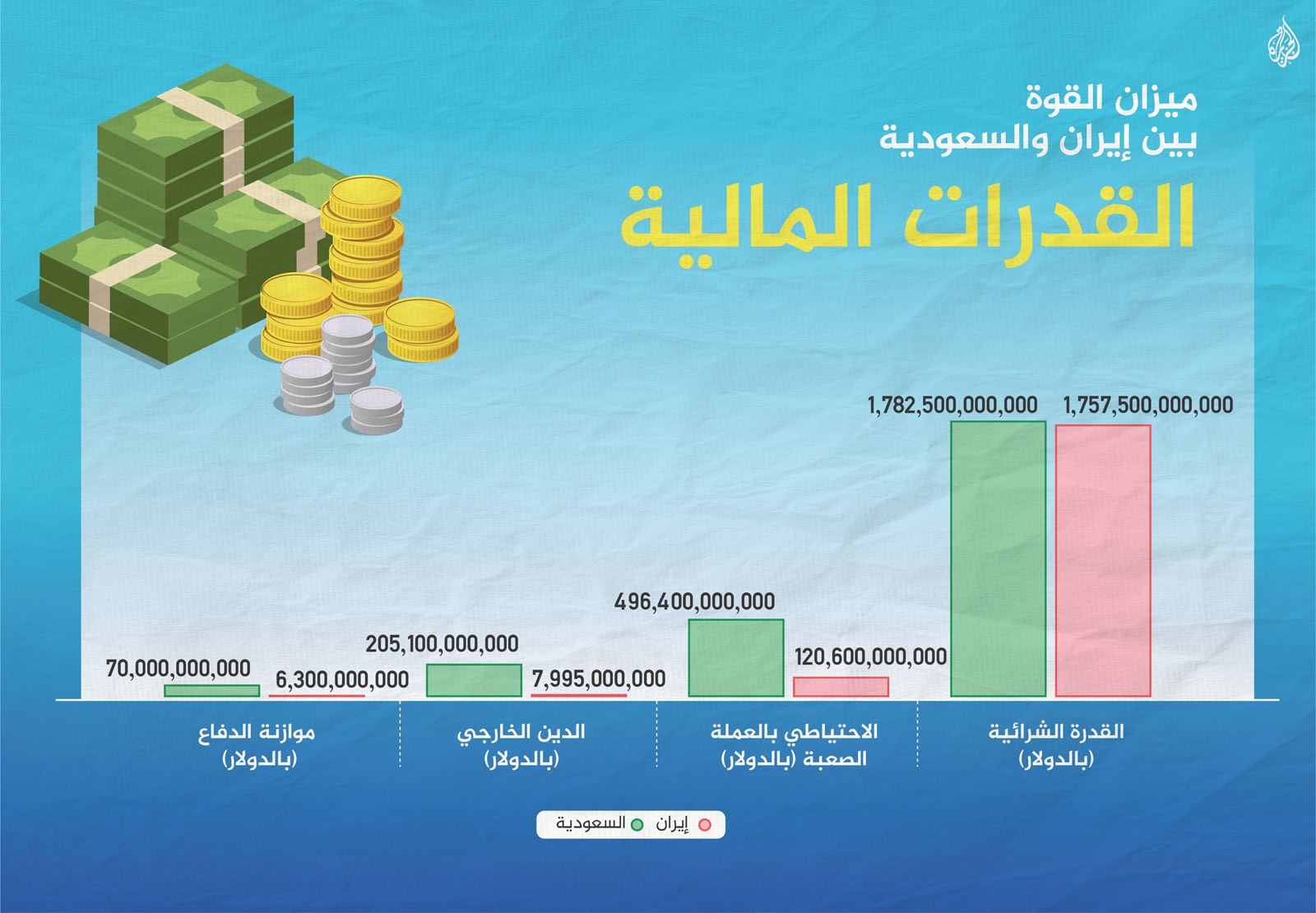 وتبلغ موازنة الدفاع في السعودية نحو 70 مليارا، في حين تقل عن 7 مليارات دولار في إيران، وفي حين بلغ الدين الخارجي لإيران نحو 8 مليارات دولار، يرتفع الدين الخارجي للسعودية إلى نحو 205 مليارات دولار.
