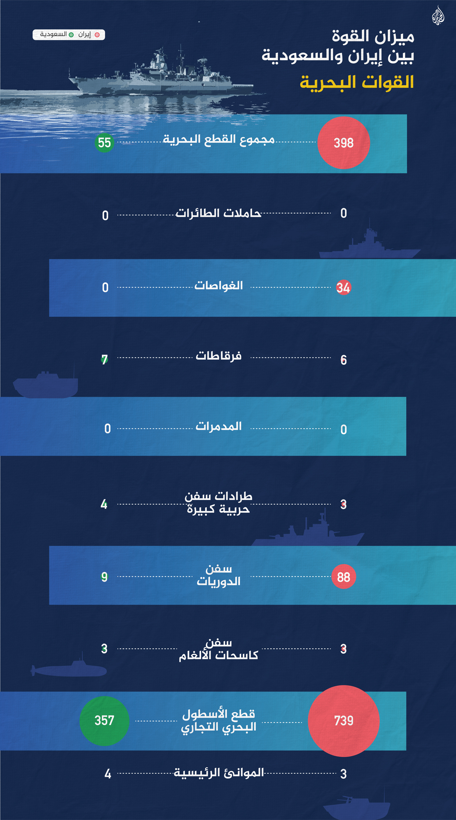 ويظهر التفاوت بين الدولتين الجارتين أيضا في عدد القطع البحرية، حيث تمتلك إيران 398 قطعة بحرية عسكرية مقابل 55 فقط للسعودية.