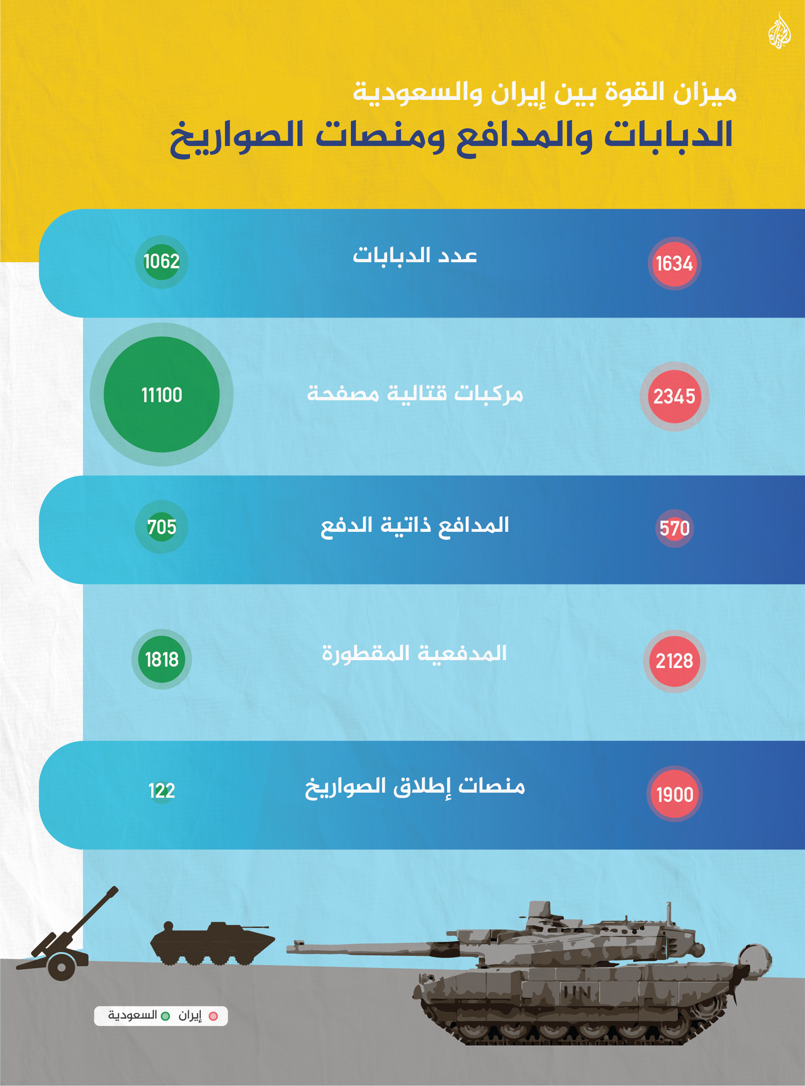 تمنح أرقام وبيانات الموقع إيران تقدما كبيرا على السعودية في عدد الدبابات، حيث تمتلك 1634، مقابل 1062 دبابة للسعودية، ولكن الرياض تتفوق عليها بشكل كبير في عدد مركبات القتالية المصفحة، إذ تمتلك السعودية 11100 مركبة، في حين لا يتعدى ما لدى إيران 2345.