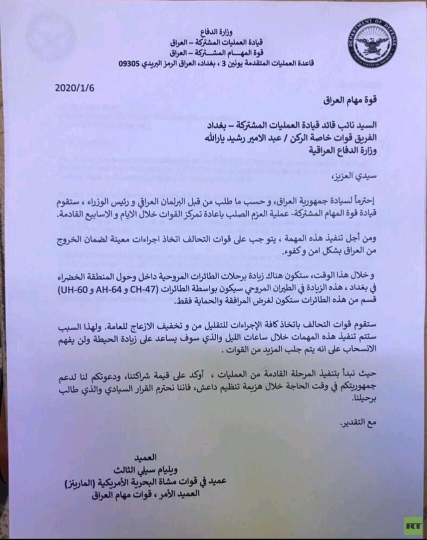"نؤكد على قيمة شراكتنا ودعوتكم لنا لدعم جمهوريتكم في وقت الحاجة خلال هزيمة تنظيم داعش ونحن نحترم القرار السيادي الذي طالب برحيلنا".