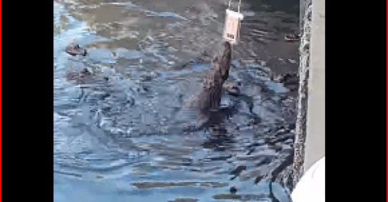 وقام السائح بربط جهاز الكمبيوتر اللوحي الخاص به في حبل ووضعه في كيس للحماية من الماء، وأنزله لسطح البحيرة حتى يمنح الآخرين فرصة لالتقاط صور للتماسيح وهي تقفز.