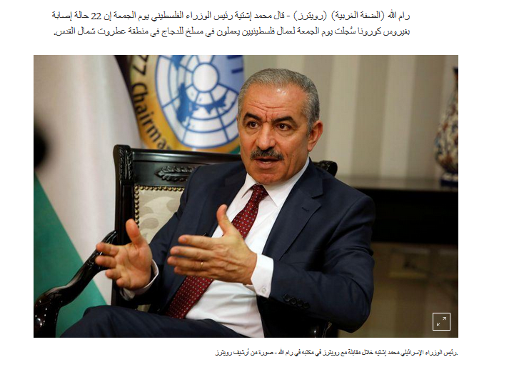 نشرت وكالة رويترز خبرا لرئيس حكومة رام الله محمد اشتية يتحدث فيه عن عدد الإصابات بكورونا التي سُجلت في الأراضي الفلسطينية.