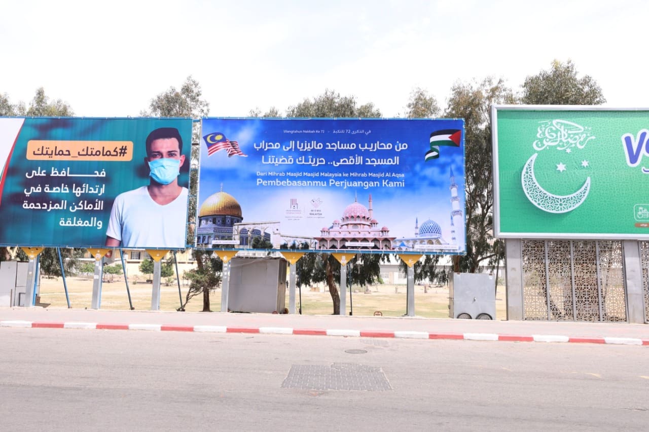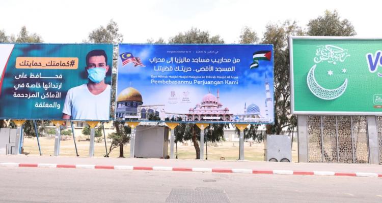 ومن بين هذه الأنشطة، لافتة على مفترق السرايا بغزة، باللغتين العربية والماليزية، جاء فيها: "من محاريب ماليزيا إلى محراب المسجد الأقصى.. حريتك قضيتنا".