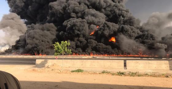 وأظهرت لقطات فيديو نشرت عبر مواقع التواصل الاجتماعي حريقا ضخما امتد لمسافة نحو مئة متر ويلتهم عددا من السيارات على الطريق.