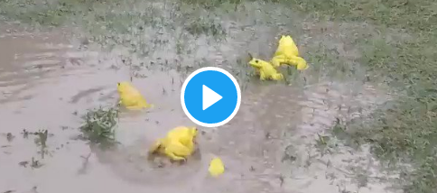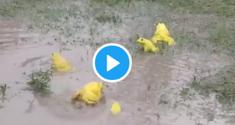 يظهر في الفيديو مجموعة من الضفادع الذكور يتغير لونها خلال الرياح الموسمية إلى اللون الأصفر الفاتح.