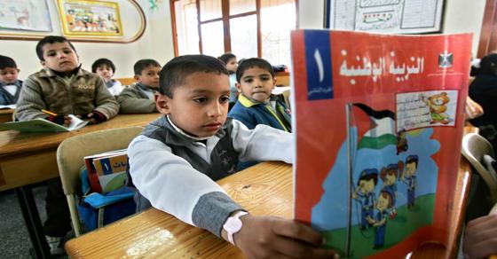 في المقابل، يتحدث الكاتب أن "معهد إمباكت وضع عينة من مادة العلوم الفلسطينية، التي استعانت بمثال عن قوة الحركة باستخدام المقلاع أو الرماية، بجانب صورة المواجهة العنيفة كأداة للدفاع عن النفس، فيما كتب أعضاء في البرلمان الأوروبي أن الكتب الفلسطينية مليئة بالمحتوى والصور اللاسامية المقلقة، وخطاب الكراهية، والتحريض على العنف، وتمجيد الموت والجهاد في جميع الفصول الدراسية والمواضيع، مما يستدعي تجميد 5٪ من تمويل السلطة الفلسطينية حتى تجري تغييرات جوهرية في مناهجها".