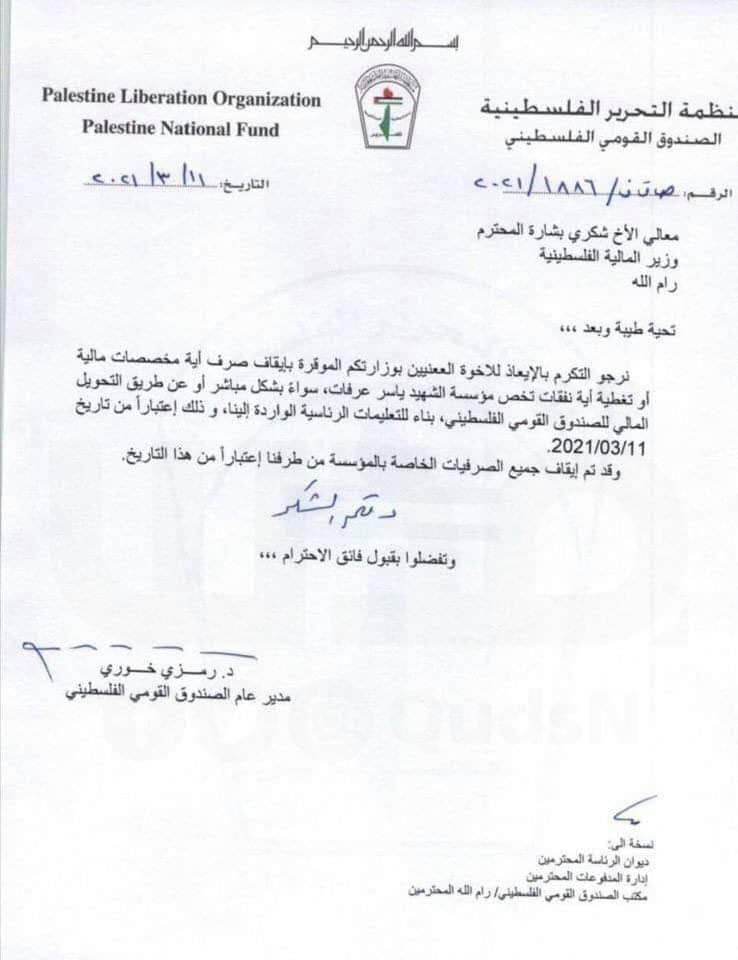 ووفق وثيقة مسربة، فإن مدير عام الصندوق القومي الفلسطيني رمزي خوري، خاطب وزير المالية في الحكومة برام الله شكري بشارة، جاء فيه "نرجو الإيعاز بالتكرم للإخوة المعنيين بوزارتكم الموقرة بإيقاف صرف أية مخصصات مالية أو تغطية أية نفقات تخص مؤسسة الشهيد ياسر عرفات".