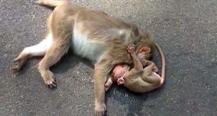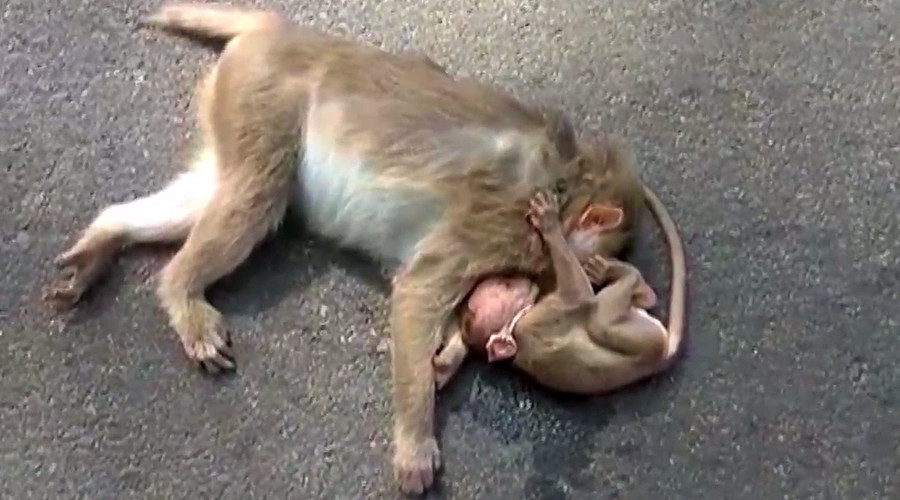 نشرت وسائل إعلام مقطع فيديو لقرد رضيع يتعلق بأمه باكيًا على موتها بعد أن دهستها سيارة في حادث مروري جنوب الهند.